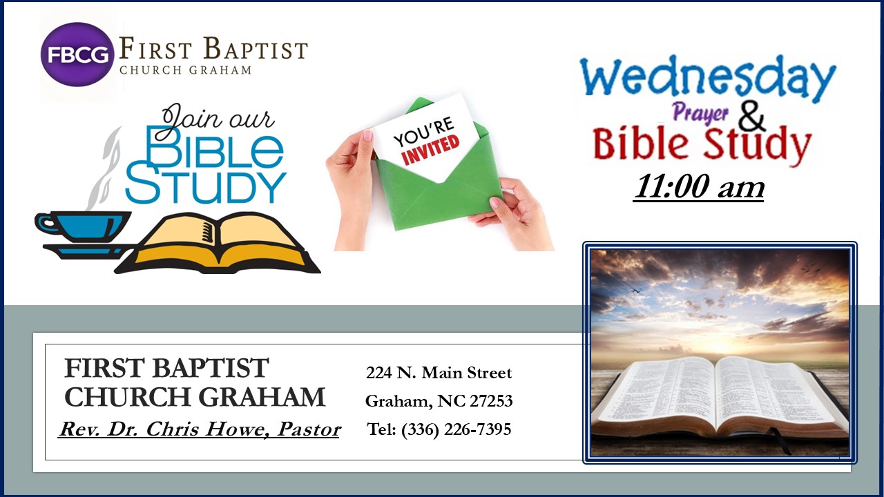 If you want to look at several of our Sunday Bulletins, click here. Our Sunday services are conducted at 11:00am. The services are broadcast live on radio stations 920-AM or 104.5FM. We “live-stream” our service on Facebook First Baptist Church of Graham | Facebook and also here on our web page Live Streaming Sunday Service.